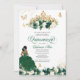 Quinceanera convite em esmeraldas profundas ou verdes, com borboletas de ouro e uma bela tiara e uma garota de vestido de bola. Visite o compro para obter mais variações no tom de pele e combinações de cores