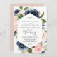 Este cartão de convite para casamento branco de flores e marinhos é perfeito para um casamento floral. O clássico e elegante design apresenta marinho de aquarela azul e flores cor-de-rosa pinceladas.