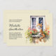 Convite de aniversário para mulheres com pintura em aquarela de um lindo gato amarelo sentado no parapeito da janela com um vaso de flores vermelhas.