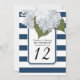 Números de mesa para o seu chá de noiva, festa de aniversário, recepção de casamento ou outro evento formal. Hortênsias brancas pintadas à mão são combinadas com um padrão de listras largas e modernas em azul-marinho e branco com um contorno prateado brilhante. Uma moldura com canto chanfrado inspirada no art déco completa o design. direitos autorais, Audrey Jeanne Roberts.