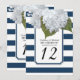 Números de mesa para o seu chá de noiva, festa de aniversário, recepção de casamento ou outro evento formal. Hortênsias brancas pintadas à mão são combinadas com um padrão de listras largas modernas em azul marinho e branco com um contorno prateado brilhante. Uma moldura com canto chanfrado inspirada no art déco termina o design. direitos autorais, Audrey Jeanne Roberts.