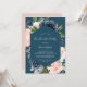 Este convite de festa de solteira azul e flores marinhos é perfeito para um evento floral. O clássico e elegante design apresenta marinho de aquarela azul e flores cor-de-rosa pinceladas sobre fundo azul-lacrimogêneo. Personalize o verso do cartão com o nome do convidado de honra e o evento.