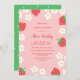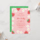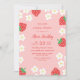 Convite para chás de fraldas bonitos, cor-de-rosa, com flores de morango e morangos. A parte de trás é verde esprinkled com um pequeno confete branco.