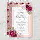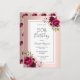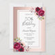 Na frente: um fundo rosa dourado cônico não é metálico com uma simples estrutura rosa-dourada e branca. Decorado com flores, rosas em burgundy. Modelos para o seu nome e detalhes da sua festa. O nome e o texto: 50º (ou qualquer idade) Aniversário são escritos com uma escrita à mão, letras cinzas escuras e coloridas. Fundo: rosa dourado falso fundo metálico com um padrão floral burguês.