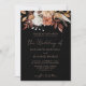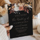 Celebre o seu casamento com este deslumbrante design de convite boêmio escuro. O impressionante fundo preto contrasta perfeitamente com o cabeçalho deslumbrante de flores aquosas outonais em terracota quente, ferrugem e branco. A escrita em tom de cobre elegante e a tipografia clássica unem todo o visual, criando um ambiente sofisticado e romântico para o seu evento de outono.