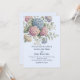 Um convite de casamento com flores delicadas de hortênsia em tons de rosa poeirento, roxo claro e azul.