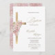 Elegante cruz dourada, confete com brilho dourado, e flores cor-de-rosa em fundo branco.