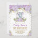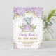 Convite para primeiro aniversario de Elefante com lavandas de flores de aquarela e borrifadas de ouro confetti. O texto é totalmente personalizável. Se quiser alterar o estilo da fonte, as cores ou o posicionamento do texto, basta clicar no botão "Clique para personalizar mais".