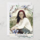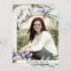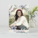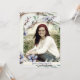 Anúncio de fotos de graduação com botânica, galhos e folhas de design. Adicione sua foto à frente das placas planas que vêm impressas ou com a opção de baixar. Seu nome e "classe de" no fundo está em uma escrita moderna em roxo sobre névoa. O anúncio e/ou a informação da parte é adicionado ao verso do artigo e é também enquadrado por ramos verdes e flores roxas azuis.