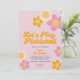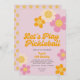 Um convite divertido para a sua próxima festa de piquete. Design apresenta flores retrógradas de ranhura realçadas com bolas de picles e as palavras "Jogar Pickleball de Vamos" em uma fonte divertida. Adicione facilmente todos os detalhes personalizados da sua parte e altere a cor de fundo. Excelente para festa de aniversário de picleball de um adulto ou criança, reunião de picleball de uma garota, fuga ou diversão diária. Pickleball - o melhor esporte de sempre!!