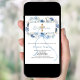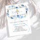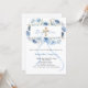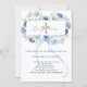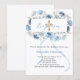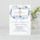 Um fundo branco elegante, decorado com flores azuis aquareladas, um arco azul e uma cruz dourada. Personalize e adicione um nome e detalhes.