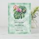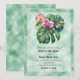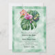 Um convite de casamento com flores orquídeas elegantes e folhas de monstera em um fundo de papel verde-pálido.