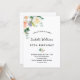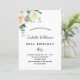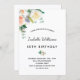 Um convite de festa de aniversário de 50 anos simples e elegante (ou qualquer idade). Um fundo branco chique. Decorado com flores pintadas à aguarela, flores em branco, rosa e dourado com folhagem. Personalize e adicione detalhes da festa com nome. Texto preto.