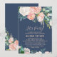 Este convite de flores românticas de peônia para uma festa azul é perfeito para um evento elegante. O design floral apresenta flores em tons de rosa claro, pêssego e branco em cascata em um fundo azul-marinho.