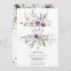 Este convite de chá de bebê moderno apresenta aquarela azul claro e violeta, flores silvestres rosa pálido, folhas verdes e galhos.