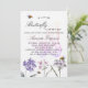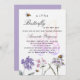 Um fundo branco. Decorados com uma borboleta grande, abelhas e flores silvestres pintadas em violeta e rosa. Personalize e adicione um nome e detalhes da parte.