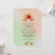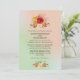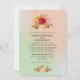 Um convite de casamento com um lindo design floral de flores silvestres com flores em vermelho e amarelo, contrastado com folhas e ramalhetes em rosa e marrom. Definido em um fundo gradiente de verde menta e rosa coral claro.