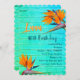 Convites de festas de aniversários temáticos de Luau. Pássaro laranja das flores do paraíso e design de madeira azul-turquesa. Personalize o texto em três locais. A borda escalada mostrada é uma das muitas opções. Mude o texto se o partido não for um luau. A idade da honraria pode ir naquela modelo, ou removê-la completamente.