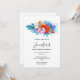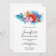 Convite de aniversário com flores tropicais vibrantes e bonitas. Orquídeas, hibisco e folhas tropicais. Cor rosa, turquesa, vermelha e laranja.