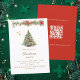Um convite de inverno para uma festa de Natal. Um fundo branco na frente, decorado com um pinheiro desenhado à mão, de cor aquosa, com ornamentos vermelhos e ouros. Algumas estrelas e uma terra decorada no Natal com cones e flores vermelhas de Poinsettia. Personalize e adicione os detalhes da sua festa. Texto do ouro. Fundo: fundo vermelho. Adicione a url do site ao código QR para RSVP e/ou detalhes da parte.