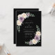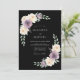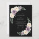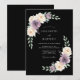 Um fundo escuro e elegante exibe um delicado arranjo botânico de flores macias de lavanda e brancas cremosas. Uma exuberante folhagem verde circunda artisticamente o design, criando uma estética romântica e sofisticada perfeita para uma celebração formal.