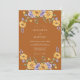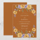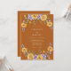 Um design quente e convidativo com um vibrante buquê de rosas amarelas e delicadas flores de lavanda arqueando sobre um fundo de terracota. Esse arranjo artístico evoca uma atmosfera romântica e ligeiramente boêmia, perfeita para uma ocasião memorável.