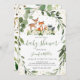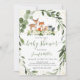 O presente convite inclui animais de floresta bonitos com acentos florais de verde e folhas de ouro.