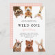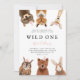 O primeiro convite de aniversário do garoto bonito e divertido, com ilustração de animais da floresta de guaxinim, raposa, veado, coruja, urso e coelho. O texto diz "Wild One". Perfeito para a festa de primeiro aniversario de uma menina.