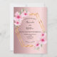 Um convite para o casamento tropical de verão elegante. Com uma falsa estrutura geométrica de ouro decorada com hibisco de rosas claro, flores tropicais com um pouco de verde. Um fundo metálico rosado e sujo. Os primeiros nomes da noiva e do noivo são escritos com um moderno roteiro de estilo. Texto preto. Traseira: fundo metálico rosado e rosado.