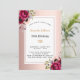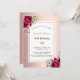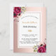 Um cartão elegante para uma festa de aniversário 50th (ou qualquer idade). Um fundo metálico rosa de ouro-chic com aparência falsa, com um simples quadro rosa de ouro e branco. Decorado com flores, rosas em ouro de burlu e rosa. Personalize e adicione um nome e detalhes da parte. O nome é escrito com um script de estilo manuscrito. Letras pretas e ouros. Fundo: rosa dourado.