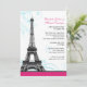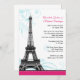 Convites: Convites de recepção de casamento parisiense elegante e moderno SOMENTE com a Torre Eiffel em tons de cinza no topo sobre um fundo rosa fúcsia com floreios em azul aqua atrás dela.