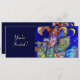Pintura aquosa colorida colorida, branca e vibrante, em cores vermelho vivo, azul, verde, amarelo-ouro, rosa, fuchsia inspirada no Carnaval de Veneza e Commedia dell'Arte. Um flautista expressivo na noite, luz da lua e um gato azul. Este design legal e artístico também é um belo presente para ocasiões especiais, aniversários, casamentos, natal, feriado, mardi gras, época de carnaval.