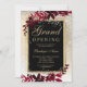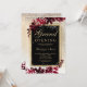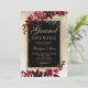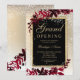 Uma tipografia de ouro moderna, chica e elegante Aquarela vermelho-borrifada floral Grande convite de festas de Natal Aberto com folhagem de folha de cor vermelha pintada manualmente num gradiente de ouro amarelo-chico com neve branca e flocos de neve.