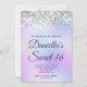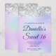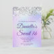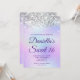 Crie seu próprio convite para comemoração de na moda 16 anos para sua filha. Gráficos cintilantes prateados decorativos formam uma borda superior. A arte digital de fundo apresenta uma folha de estilos colorida iridescente e leve. Personalize a cor do texto branco do convite ou os estilos de fonte. O texto "Sweet 16" também é personalizável. Os faíscas, brilho e folha de luxo serão criados por elementos artísticos que impressão gostam de uma foto.