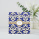 NOTA: Este é um design impresso plano. Não existem joias, fivelas, armações, metal ou artigos em camadas. É tudo lindamente reproduzido através da design gráfica. Color PALETTE Sapphire azul, creme, aspecto brilhante branco e aspecto metálico prateado quente. DESIGN MOTIF: Combinação de nome personalizado e monograma, conjuntos de convites de casamento com um belo olhar formal elegante. Esta design seria especialmente impressionante impressa no papel metálico gelado ou champanhe. Há um conjunto completo de produtos que foram criados para combinar. Seu monograma e seu nome estão centrados em uma elegante estrutura de borda de joias douradas em forma oval, com espirais barrocas gravadas. Esta é uma design de arte original de Audrey Jeanne Roberts que tem uma sensação moderna, contemporânea, de tendências e chic. É uma versão gráfica de uma damáscara por todo o padrão, renderizada em um brilho brilhante, brilho brilhante esboçado com uma banda fina de metal ouro e sobreposta em um fundo brilhante com textura e uma ligeira coloração desvanecida de cima para baixo. Muitas opções de cores estão disponíveis. No verso está um fundo de creme macio, uma moldura de ouro e cintilante que combina com um conjunto correspondente de escrita manual Spenceriana floresce, o ornamento antigo da impressora floresce pássaros adoráveis, uma ampersand e um design decorativo tipográfico com caligrafia, com outro pássaro.