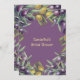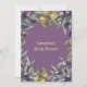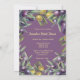 Uma bela coroa cheia de uma moldura de borda verde cheia de frutas de azeitona roxa e amarela, colocada sobre um fundo roxo que pode ser mudado para qualquer cor de sua escolha. O verso tem a mesma ilustração gráfica e todos os modelos podem ser personalizados para se adequarem ao seu chá de panela, casamento no exterior, casamentos amigáveis com o tema do orquard ou uma celebração de marco.