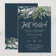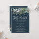 Convites elegantes e minimalistas para brunch pós-casamento apresentam folhagem trendy em aquarela e folhas botânicas em um fundo azul-marinho com escrita à mão prateada moderna que diz "casados".