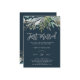 Esses convites elegantes e minimalistas para brunch pós-casamento apresentam folhagem trendy em aquarela e folhas botânicas em um fundo azul-marinho com uma fonte manuscrita prateada moderna que diz "casados".