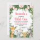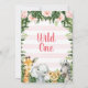 Folhagem Floral Rosa Safari Girls Wild One Invitation Sweet Girl's safari teme um primeiro convite de aniversário selvagem com quatro animais de aquarela, verde tropical ousado e rosas rosa. Esta design é uma maneira adorável de convidar convidados para uma primeira festa de aniversário de uma garota com tema safari.