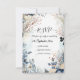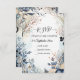 O design apresenta um arranjo etéreo e macio de tons sujos, azuis e mudados, com folhagem delicada, bagas e flores que circundam as bordas. A estrutura é predominantemente decorada com folhas do estilo aquarela, flores de algodão e bagas escuras, dando a ela uma sensação rústica mas elegante. A área central é deixada vazio, ideal para texto ou detalhes de eventos, cercada por formas orgânicas que evocam um humor sereno e autóctone. Este sofisticado, inspirado na natureza funcionaria lindamente para uma coleção de casamentos com uma atmosfera romântica e eterno.
