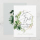 PixDezines monstera variegada, palmeiras, folhagem de ficus tubber em verde floresta claro e escuro e belo tom de cinza, verde floresta e marfim. Save the Date de Folhagem com letra de caligrafia moderna e moldura hexagonal dourada.