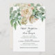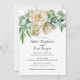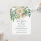 Um buquê floral com cores neutras na folhagem verde é a base para este elegante convite personalizado de Casamento. Pinos macios, verdes brancos e azeitonas, com destaque de manchas de ouro que flutuam através do design. Altere facilmente as informações para o seu convite personalizado de casamento.