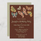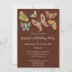 Jogue a festa perfeita com estes convites. São perfeitos para festas de aniversário ou outras ocasiões especiais. Todo o texto destes convites está pronto para o seu toque personalizado. Os convites têm bonito ilustrações do estilo de arte popular de mariposas em tons de terra de rosa, verde, marrom, amarelo e azul sobre um fundo marrom rico com o seu texto em verde-claro.