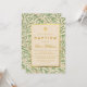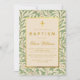 Este convite de batismo botânico elegante e neutro em termos de gênero tem um padrão de folhas de salgueiro verdes no fundo e no verso. O texto está em um retângulo que tem a cor de papel antigo e bordas de folha de ouro falso. Há uma cruz dourada (falsa) acima do texto. Todo o texto pode ser personalizado e tem uma cor dourada semelhante à moldura dourada. O nome é escrito em uma fonte caligráfica elegante, o restante em letras maiúsculas.