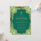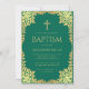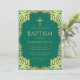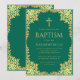 Este convite de batismo elegante em verde e dourado com um ar vintage, recomendado para um menino, tem uma moldura ornamentada em folha dourada falsa com folhas douradas sobre um fundo verde esmeralda. Acima do texto há uma cruz religiosa em folha dourada falsa. Todo o texto pode ser personalizado e tem uma cor dourada semelhante à moldura de ouro falso.