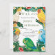 Celebre o aniversário de um ano do seu menino com este convite de festa temático tropical caprichoso. O design apresenta um grupo de papagaios exóticos adoráveis e folhagens tropicais em aquarela exuberantes