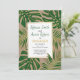 A monstera tropical verde e dourada e a palma da palma deixam o papel kraft com convite para festa de noivado. Mostra um padrão de folhas tropicais com contorno de ouro em papel kraft e seu texto em um quadro branco. O verso inclui um padrão de bolinhas dourada.