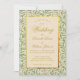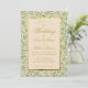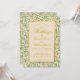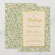Este convite de casamento elegante com um ar vintage tem um padrão de folhas de salgueiro verdes no fundo e no verso. O texto está num retângulo que tem a cor de papel antigo e bordas de folha de ouro falso. Todo o texto pode ser personalizado e tem uma cor dourada semelhante à moldura dourada. A ocasião "Casamento" e os nomes são escritos em uma elegante caligrafia, o restante em maiúsculas.