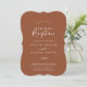 Este convite de recepção de casamento em terracota com folha mínima é perfeito para uma festa pós-casamento boho. O design apresenta uma silhueta simples de folha de verde em laranja queimado terroso com estilo desértico boêmio minimalista. Cartões de RSVP são vendidos separadamente, ou você pode adicionar informações de RSVP no verso do cartão.