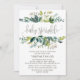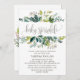 Este cartão de convite para bebê de folhagem é perfeito para um chá de fraldas rústico. A design apresenta uma fuselagem de folhas verdes e botânicos com folhas verdes. O apoio apresenta uma coroa de coroa correspondente que pode ser personalizada com o nome da futura mãe.